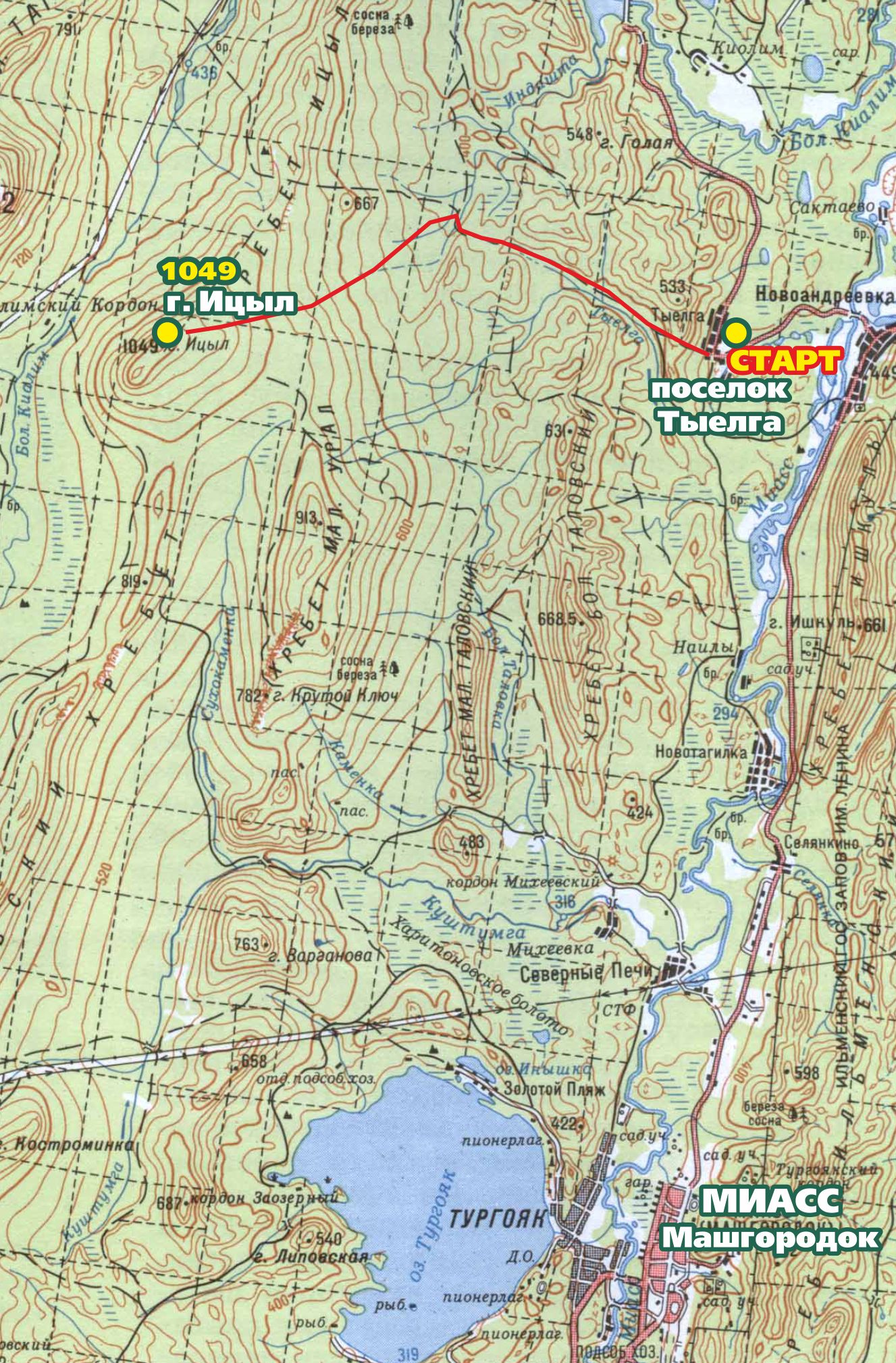 Маркированная тропа (сине-белые флажки) ведёт на южный пик горы Ицыл от дороги, соединяющей Киалимский кордон с посёлком Тургояк, через участок реликтового леса, называемый Ицыльские ельники. Начало подъёма — в двух километрах восточнее кордона